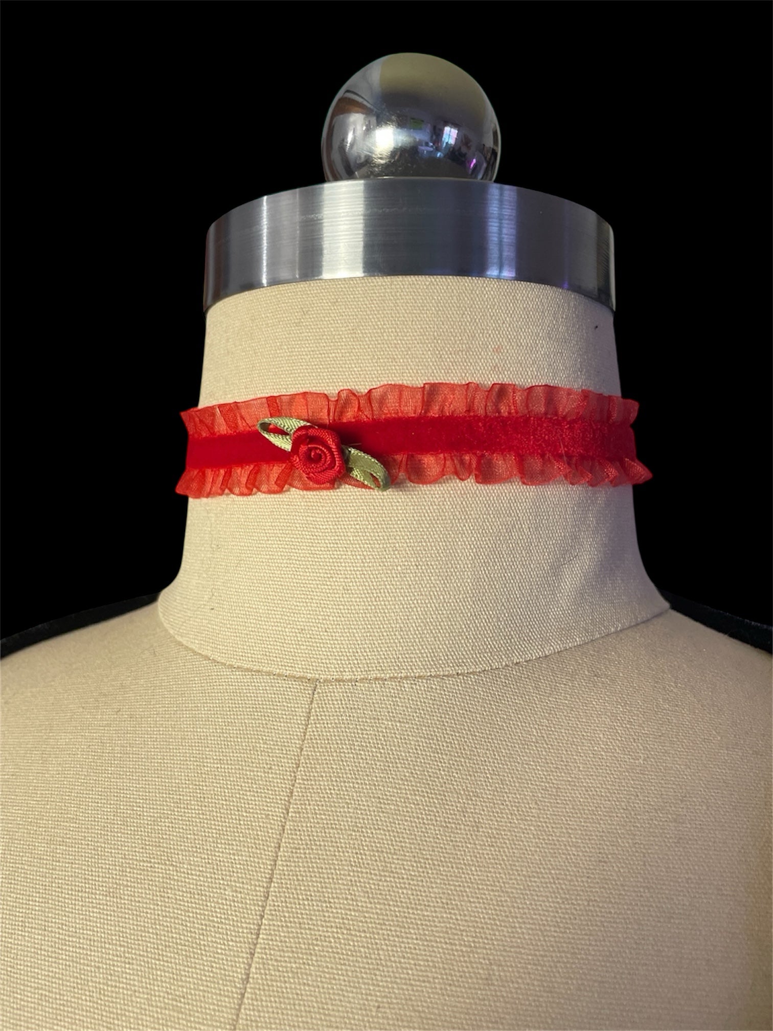 A delicate red ruffle choker with a tiny rose and leaf appliqué. Simple, romantic, and perfect for adding a vintage touch to any look.