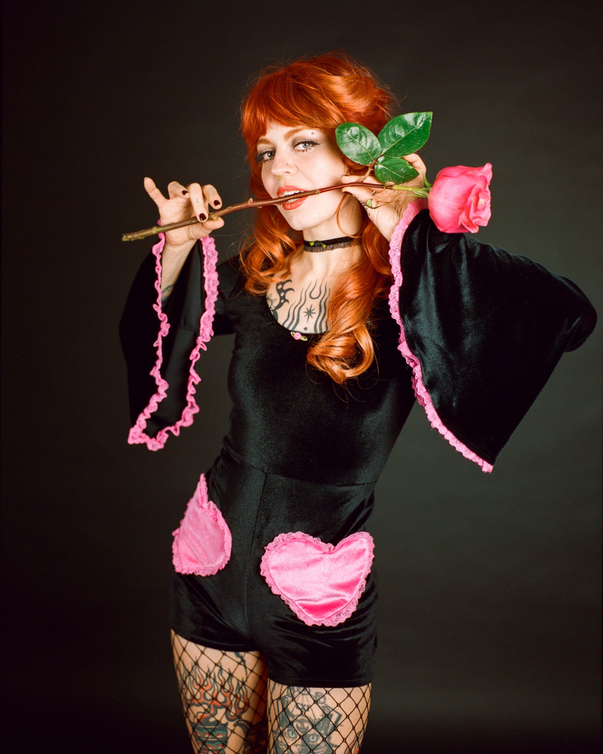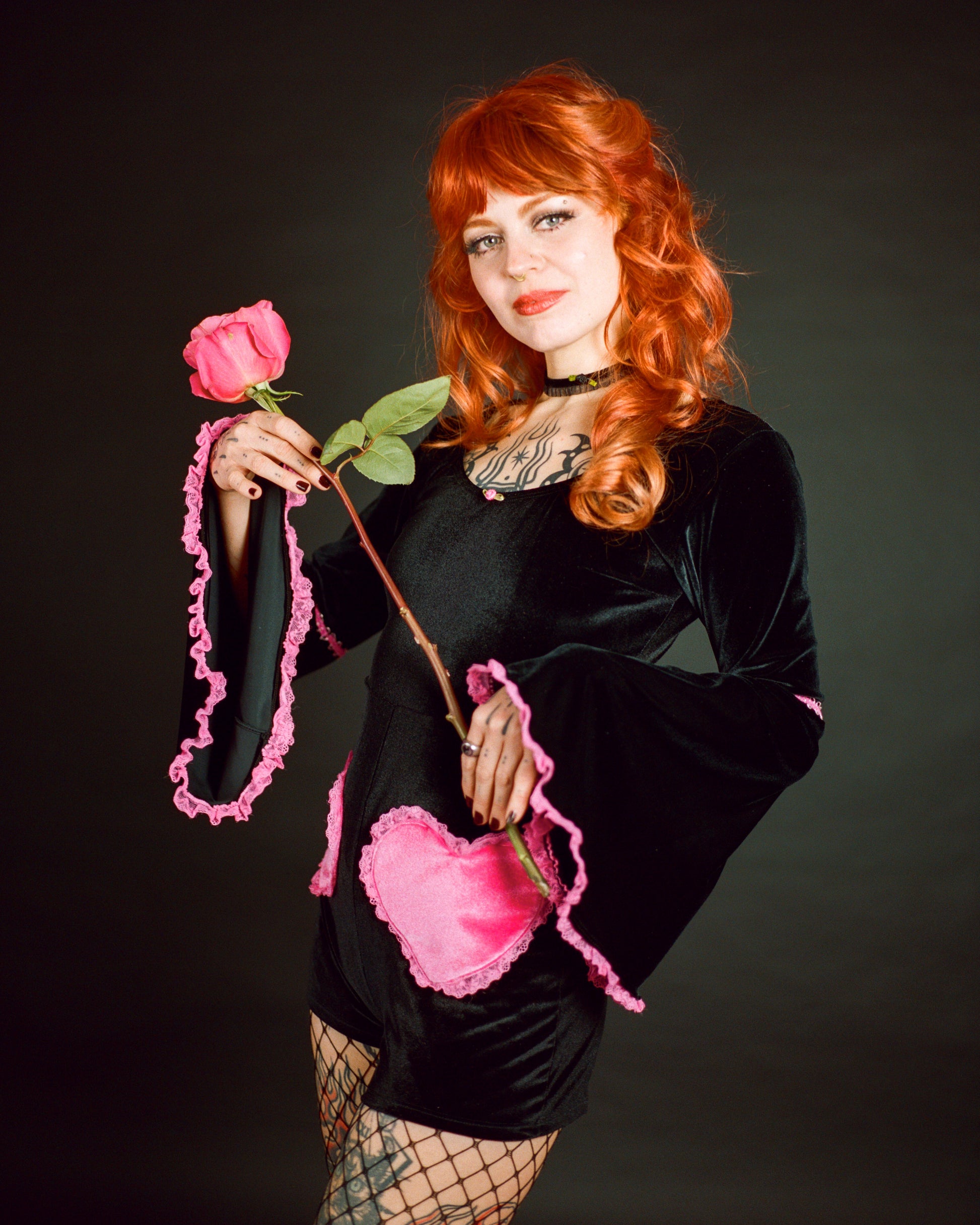 This black velvet romper features pink satin heart pocket appliqués on the front and pink ruffle trim detail on the Bell sleeves and around the hearts. Soft, playful, and perfect for those who love mixing sweet with dark.