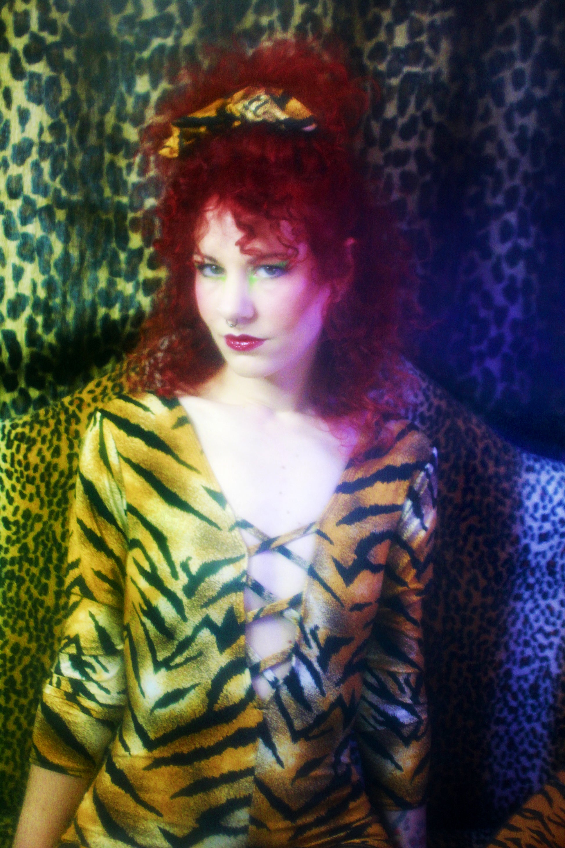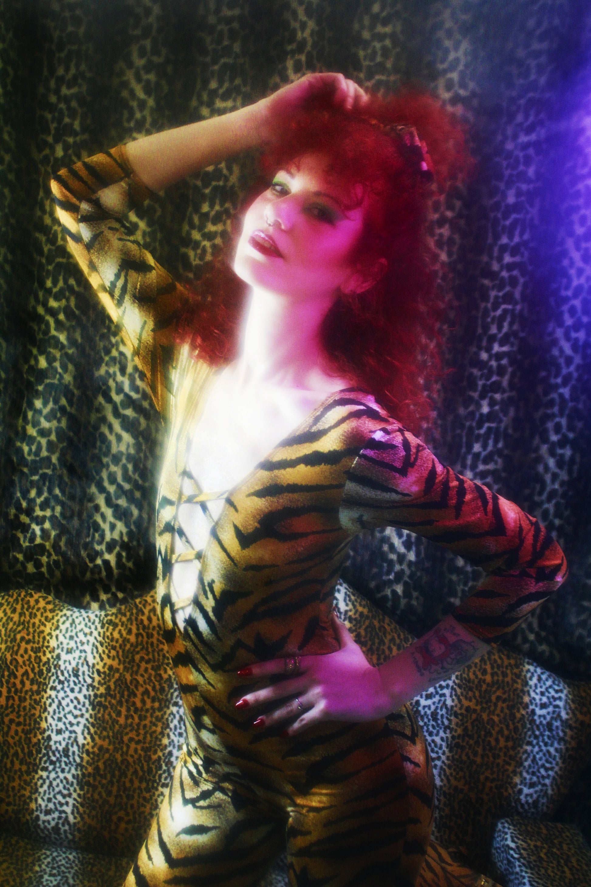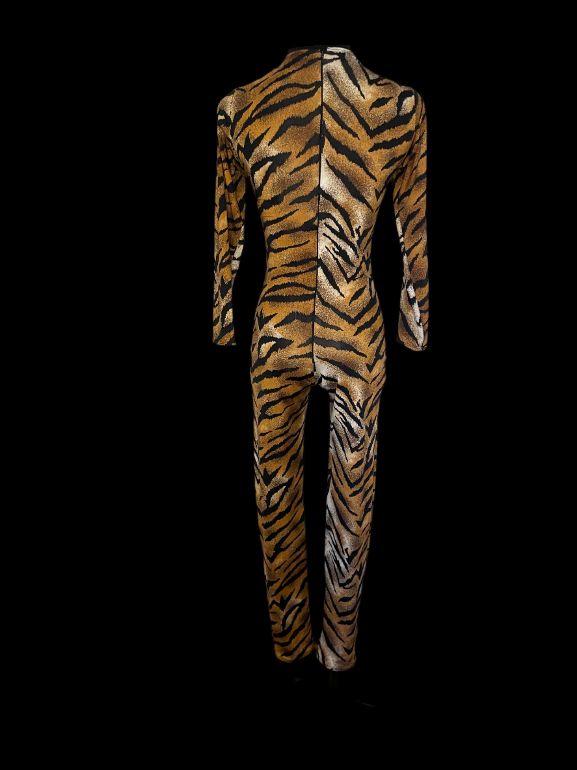 Made from fine lycra fabric in tiger print, figure-hugging jumpsuit, designed with a deep V-neckline accented by crisscrossing straps. The back features an invisible zipper closure for a seamless finish.
