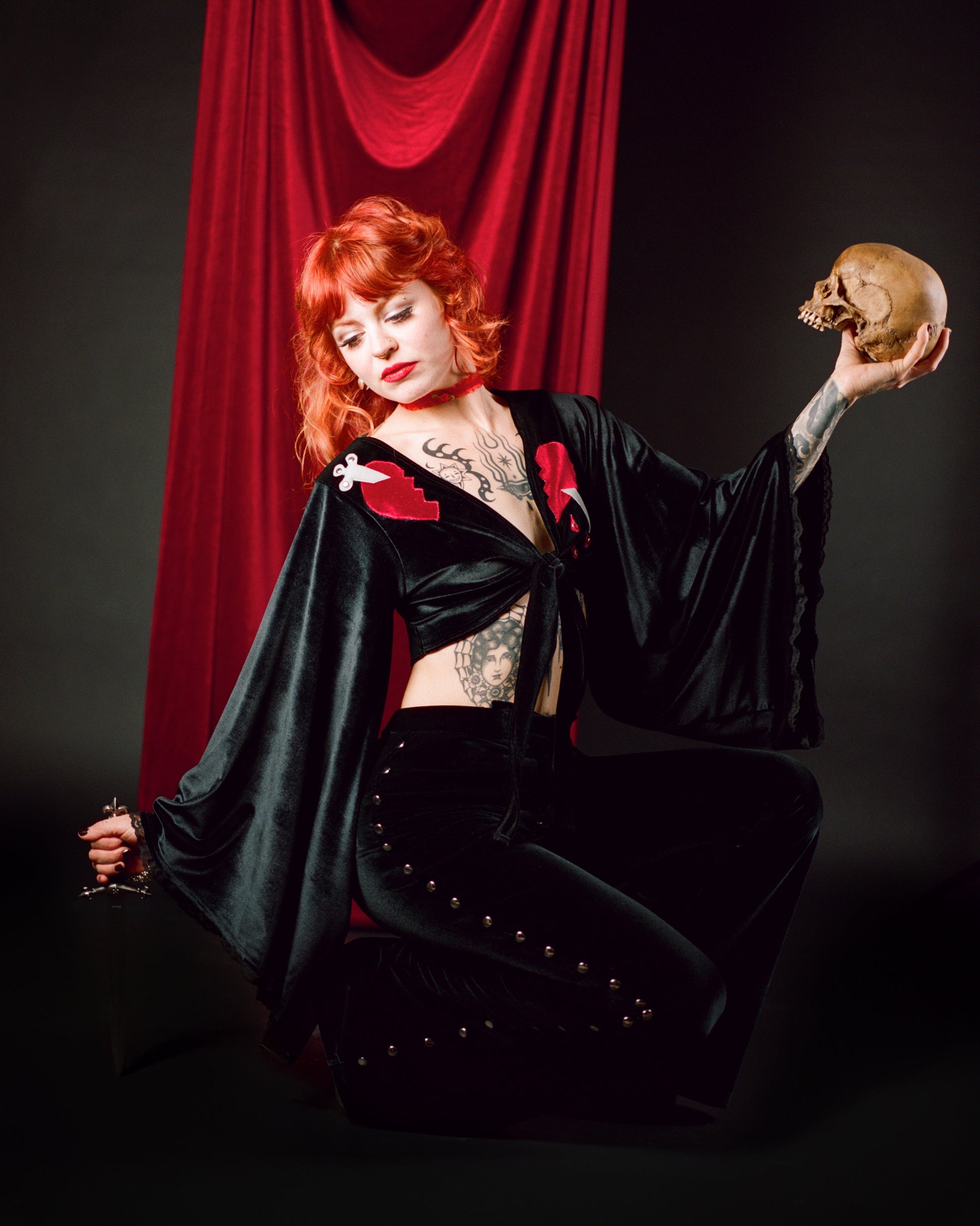 - Hand-embroidered red Bleeding heart appliqués with dagger details and little metal and cristal studs. If you order the top in Red, the rose will be made in black.
