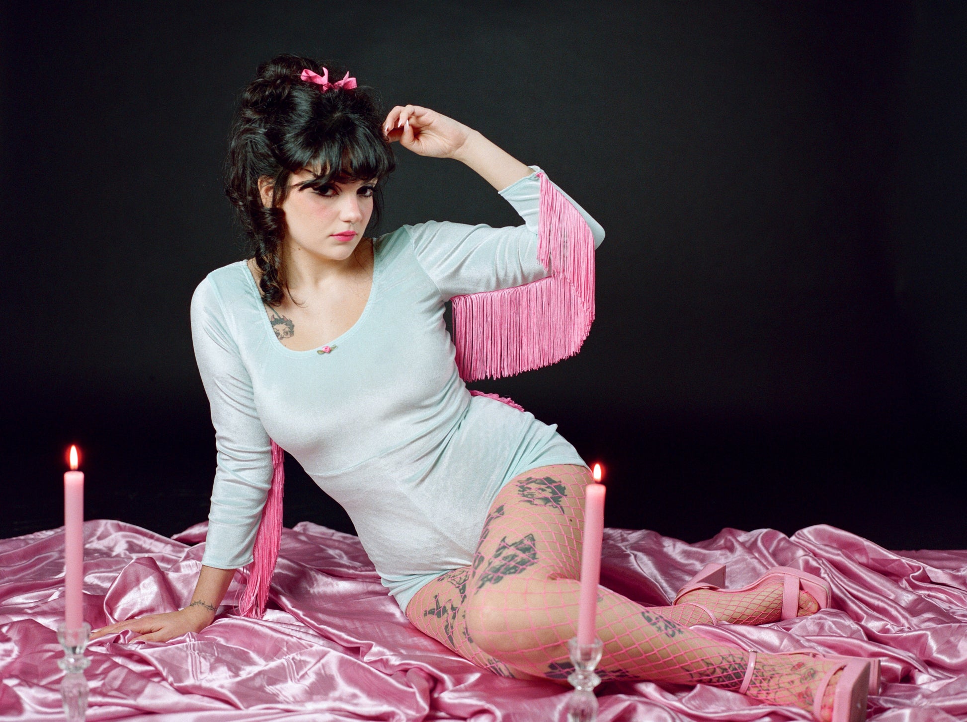 - Hot pink fringe detail across the 3/4 sleeves